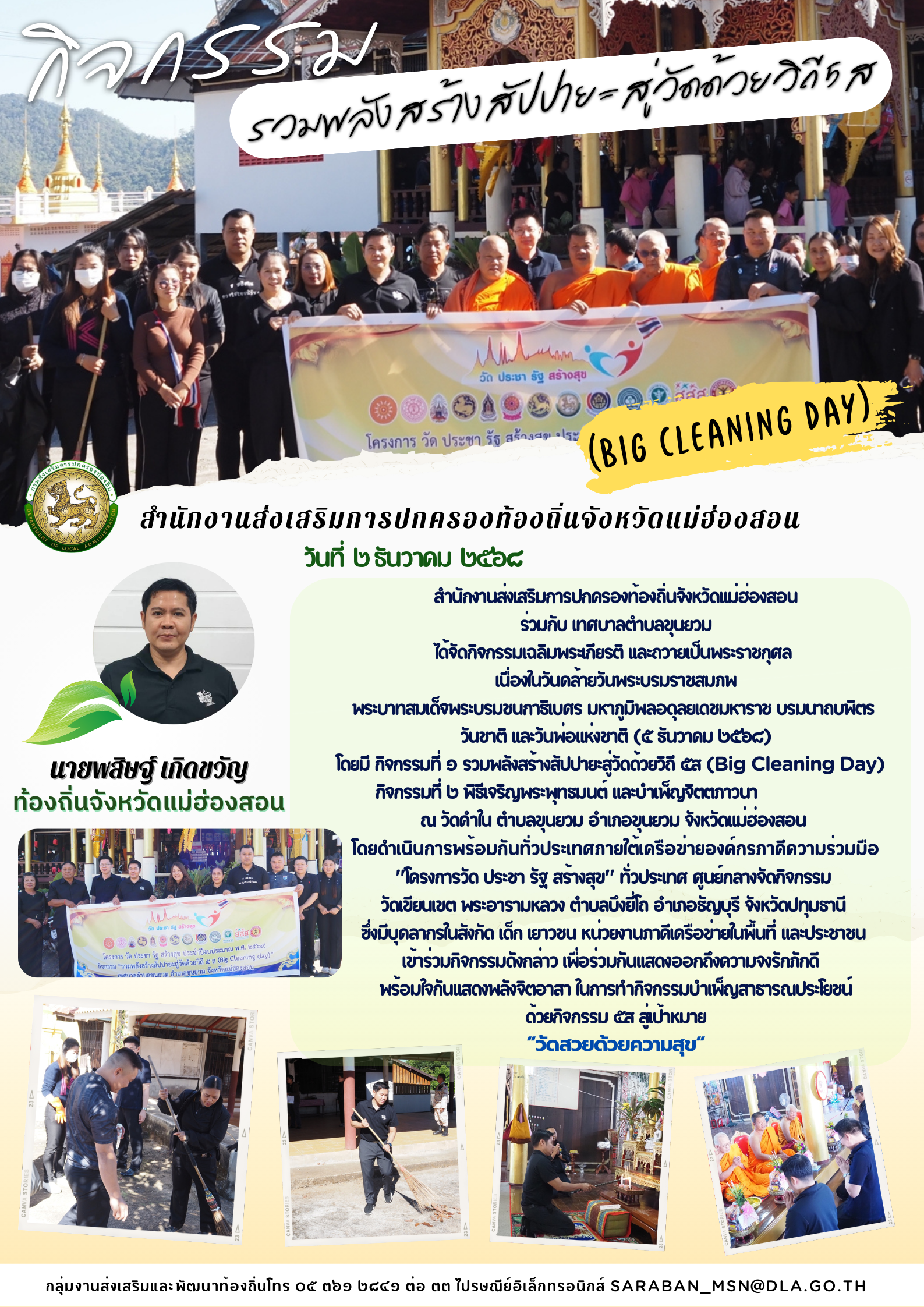 แม่ฮ่องสอน เมือง สถ.จ.แม่ฮ่องสอน ​วันที่ 15 ตุลาคม 2568 เวลา 09.00 น. นายพสิษฐ์ เกิดขวัญ ท้องถิ่นจังหวัดแม่ฮ่องสอน พร้อมด้วยข้าราชการและพนักงานในสังกัด สถจ.แม่ฮ่องสอน ร่วมกิจกรรมหน้าบ้าน น่ามอง กับเทศบาลเมืองแม่ฮ่องสอน